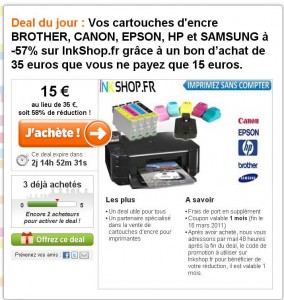 Quand on a une imprimante, on se rend vite compte que ce qui coute plus cher , ce sont les cartouches d’encres, dont le contenu au litre coute plus cher que la plupart des grands crus . Pour économiser , il peut etre interessant d’utiliser des cartouches d’encre compatibles . Pour économiser encore plus, vous pouvez acheter un bon d’achat de 35 euros pour seulement 15 euros – bon d’achat en vente jusqu’au 20 février sur le site de deals kgbdeal. Bon d’achat valable sur le site inkshop