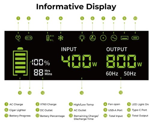 La station d’énergie mobile FOSSIBOT F800 est donc une station électrique de moyenne puissance , assez legere ( 6.5 kgs ) , qui offre donc une puissance de sortie de 800watts ( on peut donc lui brancher des appareils qui demandent jusqu’à 800 watts ) … Sa capacité avec sa batterie interne est de 512 Wh .. Elle peut donc alimenter durant 1 heure un appareil qui consomme 500watts , durant 2 heures un appareil qui consomme 250 watts … ou encore pendant 10 heures un appareil qui consomme 50 watts ..