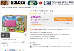 bon prix de revient pour une console nintendo 3ds xl avec le jeu animal crossing : 155 euros seulement sur priceminister gràce aux 30 pourcent du prix que l’on recupere en bons d’achats …