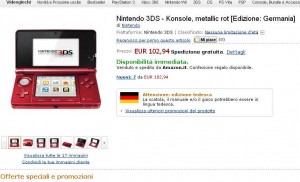 Si vous desirez une console portable Nintendo 3ds , tres bonne affaire du coté d’amazon italie .. En effet alors que la console 3d de nintendo se vend normalement entre 140 -150 euros, sur le site italien d’amazon elle est proposée à 102.94 euros .. En ajoutant les frais de port pour une livraison en France cela fait un prix total de moins de 110 euros..