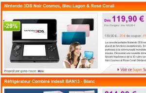 La console portable 3DS de nintendo se vend aux alentours de 155 – 160 euros .. Cependant le 18 juillet il est possible de l’obtenir pour moins de 120 euros sur priceminister..