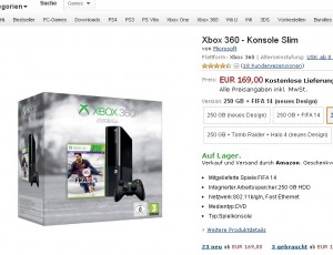 En France , le pack console xbox360 250go + le jeu fifa 14 semble se vendre autour de 200 euros (199 sur amazon.fr par exemple ) , cependant on peut économiser quelques dizaines d’euros en l’achetant sur amazon allemagne .. Le pack est en effet à 169 euros .. En ajoutant les frais de livraison cela passe le prix à 177 euros ..
