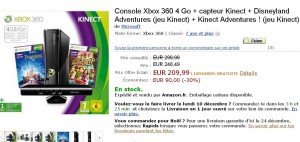 Bonne affaire console de jeux en prevision de noel … sur amazon, le 8 decembre uniquement est vendu le pack xbox 360 avec capteur kinect et le jeu disneyland adventures à 209.99 euros seulement ..