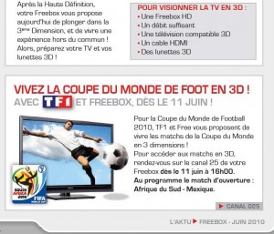 Home » High Tech » Coupe du monde de foot en 3D sur freebox Coupe du monde de foot en 3D sur freebox riczo 6 juin 2010 High Tech SaveSavedRemoved 0 Si vous etes l’heureux possesseur d’une tv compatible 3D et que vous etes fan de football Vous pourrez voir certains des matchs en 3D sur votre freebox en vous mettant sur le canal 25