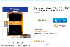 En effet , il y actuellement en vente à 70.69 euros seulement un disque dur verbatim 2.5 pouces, 1to usb 3 .. En plus il y a 5% de reversé en bon d’achats .. on recupere donc 3.55 euros .. Le prix de revient du disque est donc à peine au dessus de 67 euros ..