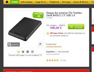 A noter qu’un autre vendeur vend ce meme disque dur un peu moins cher à 97 euros … mais il faudra ajouter qq chose à la commande pour depasser les 100 euros et utiliser le code promo … Voir le disque dur
