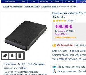 Vous voulez un gros disque dur externe et peu emcombrant ? super offre sur priceminister avec le code promo « RAKUTEN-3RSM112013 » qui donne 20 euros de remise pour 100 d’achat le 27/11 à partir de 18 heures .. En effet , on a un vendeur qui propose déjà à un tres bon prix le disque dur toshiba store basic de 2to : 109 euros .. Apres usage du code de réduction le prix passera donc à 89 euros ..