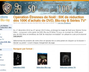 Si vous vous etes offert un lecteur de blu ray 3d avec la tv qui va avec ou alors si simplement vous souhaitez completer votre collection de films .. bonne affaire sur amazon jusqu’au 27 janvier 2013 .. En effet sur de nombreux films Warner Bros il y a 50€ de remise pour 100 d’achats .. il faut pour cela saisir le code promo « 50EUROFF » ..
