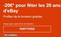 bon plan chez Ebay , avec à l’occasion du 20eme anniversaire , un coupon de réduction : PARTYFR20 … qui donne 20€ de réduction pour 120 d’achats sur une sélection de produits