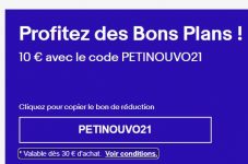 Sur Ebay , jusqu’au 31 mars il y a un code de réduction interessant : PROMO23 qui donne droit à 10% de réduction sur des milliers d’articles dans tous les domaines : high tech , auto , petit electromenager …