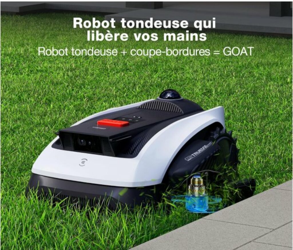 L’Ecovacs Goat O1200 LiDAR Pro c’est : robot tondeuse sans fil pour terrain jusqu’à 1200 m², Dual-LiDAR HoloScope 360 précis à 2 cm, AIVI 3D évitant >200 obstacles (hérissons), passages 80 cm, pentes 45%, coupe 3-8 cm lames pivotantes, IPX6, app cartographie auto.