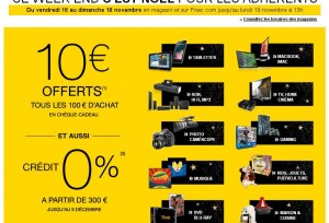 Pour les possesseurs de la carte adherent fnac, il y a actuellement jusqu’au 19/11 à 13heures des journées adherents, proposant 10 euros de bons d’achat par tranche de 100 euros d’achats ..