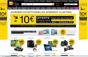Si vous êtes adherents fnac, voici une offre qui peut vous interesser : jusqu’au 24 septembre il y a 10 euros offerts par tranche de 100 d’achats sur le site internet ou en magasin (jusqu’au 23 / 09 en magasin) ..