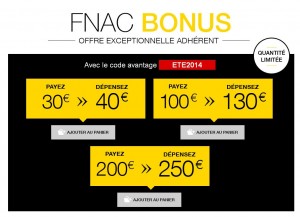 Tres bonne affaire pour les adherents fnac : il est possible d’acheter à prix réduit des bons d’achats … 30 euros le bon d’achat de 40 , 100 euros celui de 130 , 200 euros le celui de 250 …