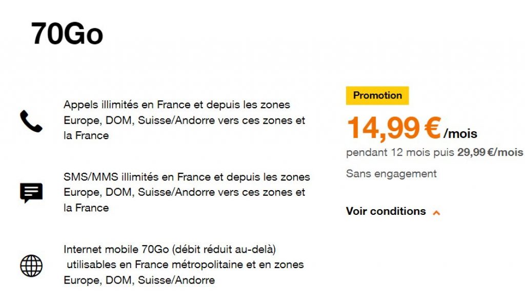 Bon plan forfait mobile ORANGE illimité + 70Go (France et Europe ) pas cher à 9.99€ par mois ! (sans engagement)