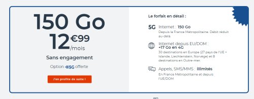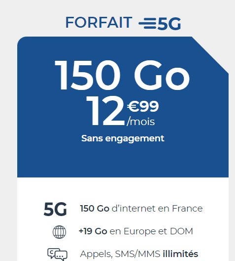 - 150Go d’internet en 5G en France avec debit réduit au dela donc sans risque de facturation de dépassement