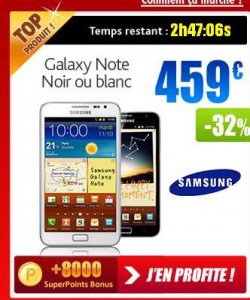 Nouvel offre sur priceminister , cette fois ci sur le galaxy note vendu 459 + 16.2 euros de frais de port le 11 avril jusqu’à midi ..