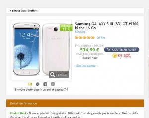 Galaxy S3 blanc sans blocage ni abonnement à moins de 545 euros port inclu