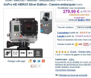 Go pro Hero3 silver edition à moins de 280 euros