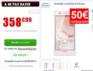 Pour les femmes qui désirent un smartphone puissant,offre qui peut etre interessante du coté de cdiscount .. En effet on a en precommande l’hUAWEI P6 rose à 358.99 euros .. Ce smartphone quad core à 1.5 ghz, fait de plus l’objet de 50 euros de remboursement différé de la part du fabricant .. Il revient donc à moins de 310 euros .. Smartphone android avec ecran de 4.7 pouces HD, sous android 4.2 , processeur donc quad core 1.5 ghz , appareil photo 8 millions de pixels