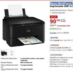 A la recherche d’une imprimante rapide, wifi , recto verso ? Tres bonne affaire à priori dans les soldes sur le site de la fnac, avec l’imprimante EPSON WORKFORCE PRO vendue 90.58 euros (livraison gratuite en retrait magasin, ou à 6.99 euros ) ..