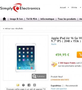 Bonne affaire aussi sur priceminister concernant l’ipad air 16go wifi le 4 decembre .. En effet la dernère génération de la tablette apple est déjà vendue 30 euros de moins que le prix généralement pratiqué à savoir 459.95 au lieu de 489 euros .. mais le 4 decembre, on peut donc passer le coupon « RAKUTEN-F122013