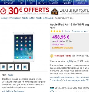 Si vous voulez un ipad Air, la bonne affaire c’est sur priceminister : vendu à 458.95 euros soit 30 euros de moins que le prix generalement pratiqué , le montant à payer descend à 428.95 euros en utilisant le code promo « RAKUTEN-FF122013 » le 11 decembre ..