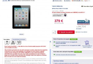 Offre qui peut etre interessante si vous désirez une tablette .. L’ipad2 16go wifi (la generation precedente) est proposé à 379 euros sur le site web de conforama .. Mais on recoit en prime un bon d’achat de 40 euros à utiliser dans tous les magasins conforama de France sur les meubles et la déco ..