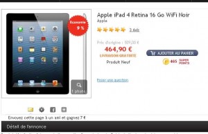 En effet alors qu’elle se vend normalement à 509 euros dans sa version 16go wifi , sur priceminister un vendeur pro la propose à 464.90 euros port inclu ..