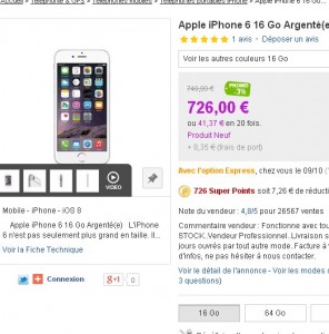 L’iphone6 16go est affiché à 726 + 8.35 euros par un vendeur pro .. expansys …