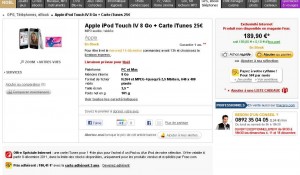 Ainsi avec l’ipod touch 8Go vendu 189.90 hors frais de port, il y a une carte itunes de 25 euros offerte .. En comptant donc les frais de port de 9 euros on à donc le baladeur pour moins de 200 euros port inclu avec une carte permettant d’acheter applications et jeux ..