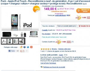 Une offre qui est peut etre interessante si vous désirez un ipod touch : sur priceminister, un vendeur pro vend l’ipod touch IV 8go reconditionné à 149 euros port inclu .. Cet Ipod est de plus livré avec plusieurs accessoires (une coque , un chargeur voiture , un chargeur secteur )..