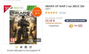 Le jeu de combat Gears of war 3 pour console Xbox 360 se vend generalement plus de 35 euros ( 39 fnac, 38 pixmania, 45 grosbill , 35 amazon … ) , mais encore une fois sur priceminister par l’intermédiaire d’un vendeur pro , on peut economiser pas mal ..