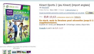 Le jeu kinect sport saison 2 pour xbox360 est vendu un peu partout plus de 30 euros ( 38 à la fnac, 40 sur cdiscount, 49 chez darty, 34 sur amazon ..) , mais sur amazon, on a la possibilité d’acheter la version « import anglais » pour 19.63 euros seulement port inclu ..