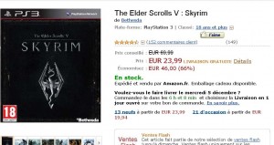 Si vous aimez les jeux vidéos de role , bonne affaire concernant le très bon « The Elder Scrolls V : Skyrim » pour consoles XBOX et PS3 .. en effet alors qu’il se vend un peu partout entre 35 et 45 euros , sur amazon, il est proposé en vente flash à moins de 24 euros port inclu (23.99 euros precisement )