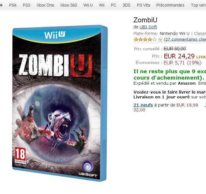 Si vous avez une console WII U et que vous n’avez pas l’un des meilleurs jeux existant pour celle ci à savoir ZOMBIU .. Offre interessante pour ce jeu en le commandant sur le site anglais Base.com .. En effet en France on le trouve semble t-il au mieux autour de 25 euros . Mais sur le site anglais base , il est à 15.39 euros …