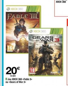 Dans le catalogue des hyper carrefour qui va du 3 au 9 octobre, on peut voir une offre intéressante concernant des jeux videos pour xbox360 .. avec Fable 3 et Gears of War3 à 20 euros chacun ..