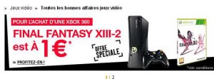 Très bonne affaire sur le site de la fnac si vous desirez une Console de jeu XBOX360 de microsoft : en effet , pour tout achat d’une xbox360 , le jeu Final Fantasy XII-2 qui vient de sortir est à 1 euro seulement .. et ce jeu est vendu un peu partout entre 50 et 60 euros ..
