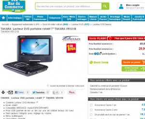 Si vous désirez un lecteur de dvd portable, notamment pour occuper vos enfants durant les trajets en voiture, prix tres interessant du coté de rueducommerce : en effet on a un lecteur dvd portable takara avec ecran de 7 pouces pour 29.99 euros .. En ajoutant la livraison en point relais (4.99) on a donc un prix final à payer de moins de 35 euros ..