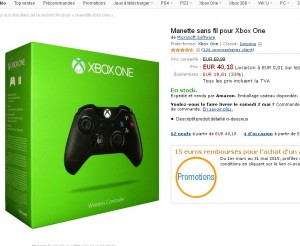 Bon plan pour les possesseurs de console microsoft xbox one et qui désirent une manette supplementaire : sur amazon, on peut voir la manette sans fil en promo à 40 euros … En plus on a microsoft qui propose une offre de remboursement de 15 euros ..