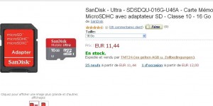 Ainsi la carte mémoire micro sd sandisk classe 10 de 16go est à 11.44 euros .. la 32go à 22.60 et la 64go à 49.96 … Les cartes sont livrées avec un adaptateur sd et peuvent donc etre utilisées aussi dans des appareils photos et camescopes par exemple ..