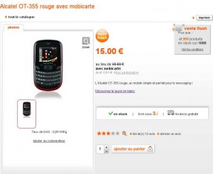 Home » High Tech » Mobile a clavier Alcatel OT 355 à 15 euros en formule mobicarte sans engagement Mobile a clavier Alcatel OT 355 à 15 euros en formule mobicarte sans engagement riczo 2 avril 2012 High Tech SaveSavedRemoved 0 Si vous cherchez un petit mobile à clavier pour ecrire facilement des sms , sur le site orange , se trouve toujours en vente flash l’alcatel OT355 à 15 euros seulement avec une carte mobicarte incluant 5 euros communications Cliquez ici pour voir ce mobile Attention, le mobile sera verrouillée sur le reseau orange .. mais outre la puce mobicarte , il pourra etre utilisé par exemple avec une puce sosh