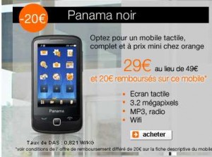 Et une nouvelle vente flash concernant le telephone tactile Panama proposé en formule mobicarte sans engagement à 29 euros au lieu de 49 par orange du 11 janvier à 19 heures jusqu’au 12 janvier à 23h59 ..