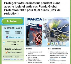 Home » High Tech » Moins de 10 euros l’antivirus Panda 2012 avec mise à jour durant 3 ans Moins de 10 euros l’antivirus Panda 2012 avec mise à jour durant 3 ans riczo 14 juin 2012 High Tech, Sites de Deals SaveSavedRemoved 0 Encore une super offre antivirus qui vous interessera donc si vous devez proteger un pc . Sur groupon, pour 9.99 euros on peut donc obtenir Panda Antivirus global protection 2012 pour 1 poste / 3 ans .. Cliquez ici pour voir cette offre