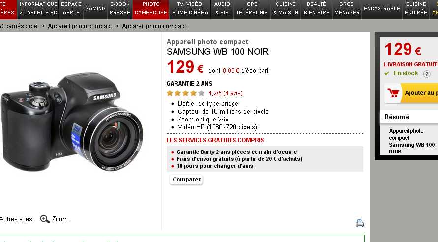 Moins de 100 euros l’appareil photo bridge samsung WB100 avec zoom x26