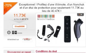 Si vous avez une console wii et qu’il vous manque une ou plusieurs manettes pour jouer à Mario Kart Wii ou à d’autres jeux .. Bonne affaire sur Igraal qui propose un deal permettant d’obtenir pour 11.73 euros port inclu un pack regroupant la manette compatible wiimote et nunchuk ..