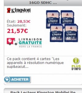 21.57 euros un lot de 4 cartes SD 16go classe 4 kingstong sur le site zoombits qui livre gratuitement