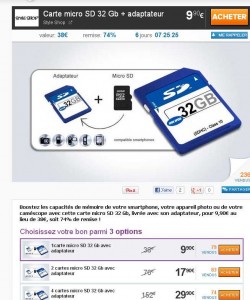 S’il vous faut des cartes mémoires micro sd ou sd de bonnes capacités et rapides .. bonne affaire sur le site kgbdeal : en effet on peut acheter un bon valable pour l’achat de cartes mémoires micro sd 32go classe 10 à prix reduits .. cartes livrées avec un adaptateur micro sd/ sd et pouvant donc etre utilisées en tant que cartes sd ..