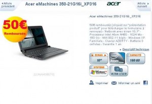 Voici encore une chance pour vous . En effet jusqu’au 6er décembre, Cdiscountpropose un netbook acer (reference emachine 350-21G16i-XP316) à 249 euros mais avec une offre exclusive (proposée seulement chez cdiscount) de 50 euros .