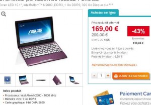 Le netbook Asus 1025CE-PUR015S est à nouveau disponible sur la boutique en ligne carrefour à 169 euros ..